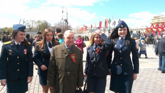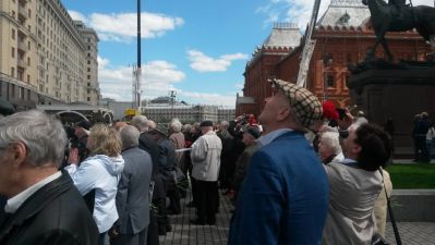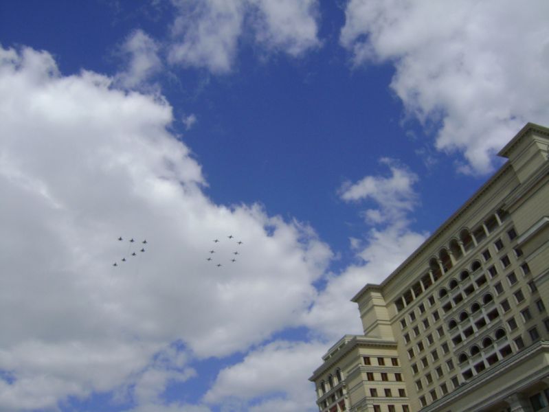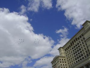 Трогательно и трепетно. Ветераны также почтили память маршала Жукова, возложив цветы к его памятнику. Во время фотографий на память в небе над Охотным рядом появились самолеты. Началась репетиция лётного парада на Красной площади. Ветераны стали свидетелями воздушного праздника. Самолеты построили в воздухе цифру 70, что означало 70 - летие Победы!!!