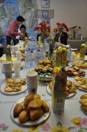 Праздничный стол встречи для земляков накрыла профессионал по сервировке праздников РОО ЗСЗ Русакова Людмила Ивановна. Всех поразили вкуснейшие пирожки с творогом и капустой землячек. Огромное им спасибо! ИмеНИНными пирогами с ямальской брусникой угощала исполнительный директор Сосова Нина. Звучали тосты за юбилей Победы, замечательно играл и пел Виктор Соломенцев, ему подпевал хор женщин - землячек, красиво танцевала Лидия Шмаль.