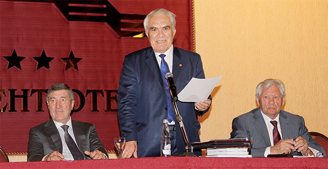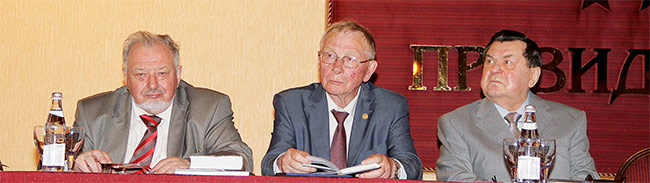В президиуме – корифеи нефтегазовой отрасли академик РАН А.Э. Конторович; министр природных ресурсов РФ в 90-е гг., президент Российского геологического общества В.П. Орлов; министр геологии СССР в 70 – 80-е гг. Е.А. Козловский