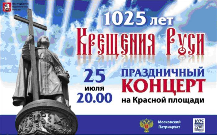 На Красной площади 25 июля в 20:00 состоится праздничный концерт, посвященный 1025-летию Крещения Руси. Вход свободный.