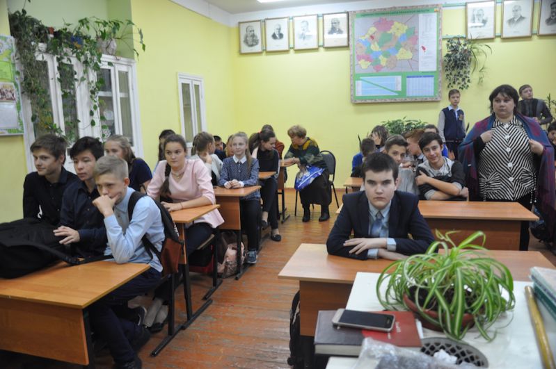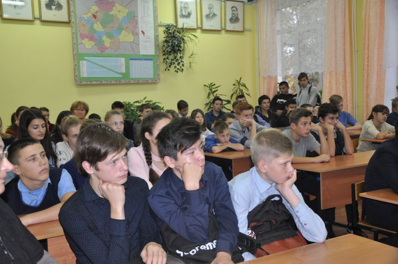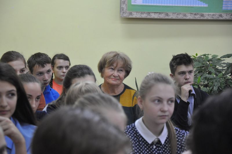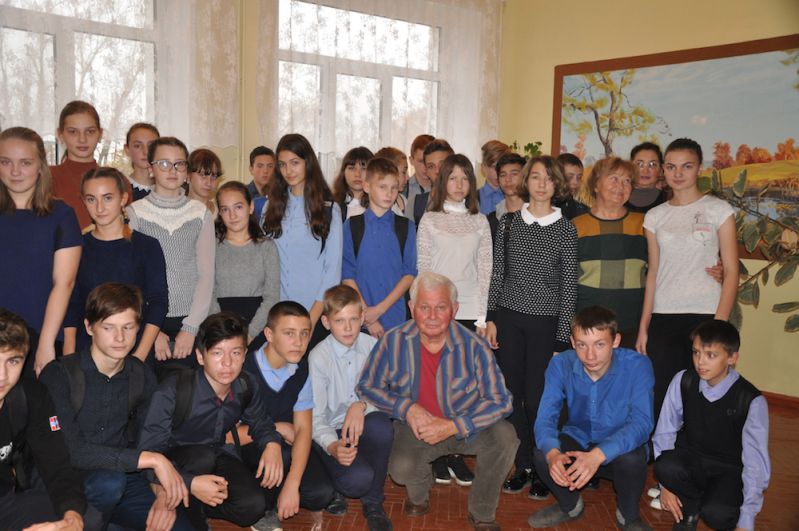 Наше общение со старшеклассниками Павелецкой школы несколько затянулось, и моя супруга Нина Алексеевна, сидевшая на заднем ряду с Олей – внучкой В.Н. Воеводиной, уже стала жестами мне намекать о завершении встречи. Традиционно в коридоре школы разместили всех присутствующих для коллективного фото.