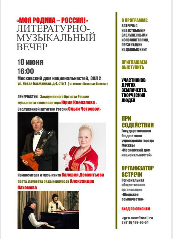 В преддверии Дня России члены Югорского землячества собрались в Московском доме национальностей. Литературно-музыкальный вечер «Моя Родина-Россия», организованный по инициативе Лидии Ивановны Шмаль 10 июня, представил творчество наших земляков и гостей Югорского землячества.