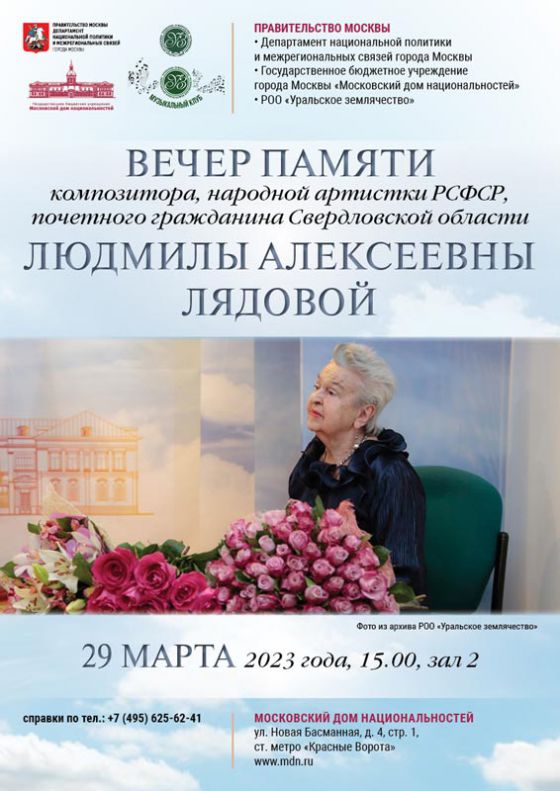 29 марта 2023 года в Московском доме национальностей состоится вечер памяти композитора, народной артистки РСФСР Людмилы Лядовой – давнего друга нашего землячества.