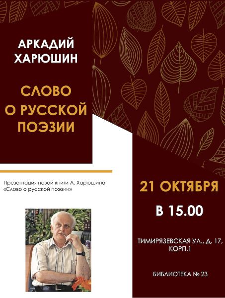 «Слово о русской поэзии» – так называется новая книга Аркадия Харюшина. Ее презентация состоится 21 октября в 15 –00 в библиотеке № 23 по адресу: Тимирязевская ул., д.17, корп.1 .