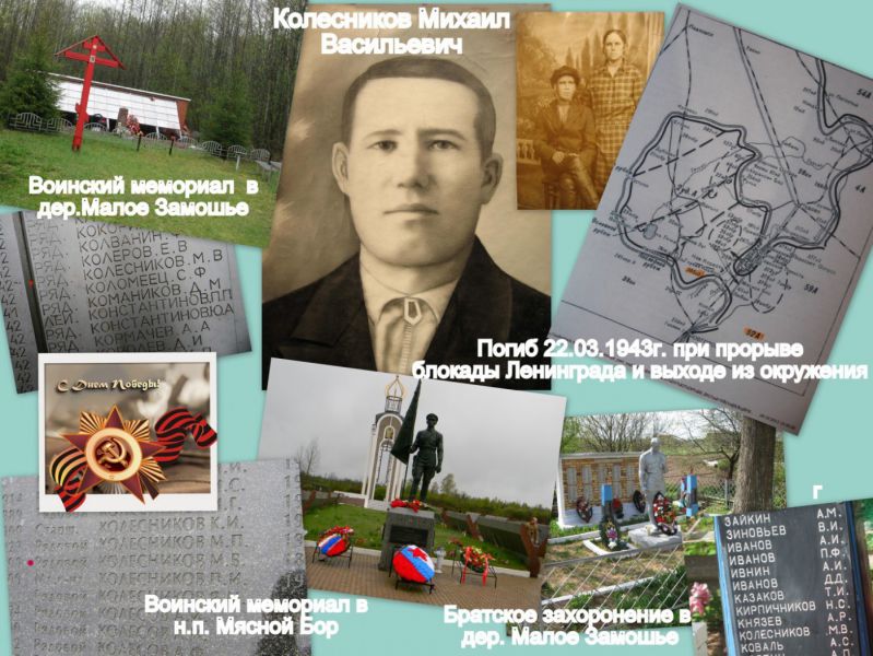 Теперь, после долгих и мучительных поисков о судьбе отца я знаю почти всё. Отец погиб 22 марта 1942 года на Волховском фронте (52 армия, 305СД, 1004СП) при прорыве блокады Ленинграда и выходе из окружения по направлению на н.п.Мясной Бор. Похоронен в братском захоронении в деревне Малое Замошье Новгородской области. Имя отца записано на мраморных досках мемориалов М.Замошье, Мясной Бор и на родине -  в селе Фоминское.