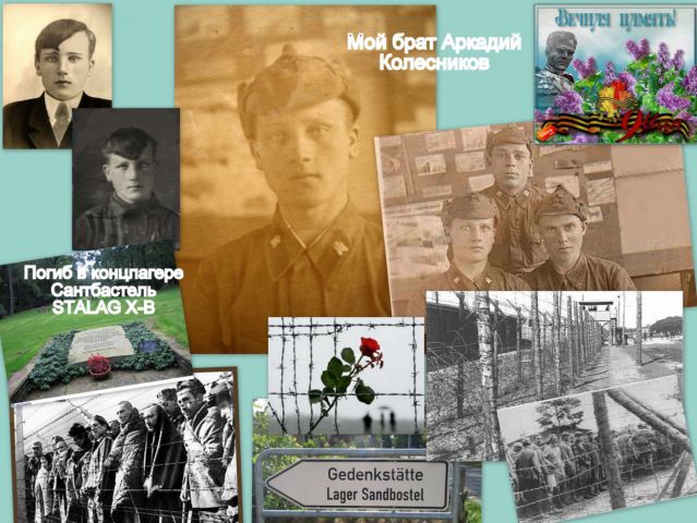 С розыском брата Аркадия дело обстояло сложнее. Установлено, что его дивизия была окружена на второй день войны, большинство были убиты или попали в плен. Брат попал в немецкий концлагерь Зандбастель (Stalag X-B) под Гамбургом и погиб при организации побега в 1943 году.