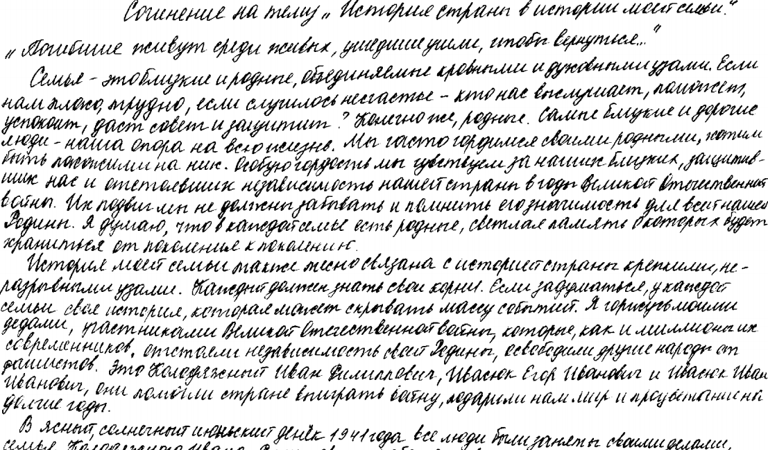 Семья – это близкие и родные, объединяемые кровными и духовными узами. Если нам плохо, трудно, если случилось несчастье – кто нас выслушает, поможет, успокоит, даст совет и защитит? Конечно же, родные. Самые близкие и дорогие люди – наша опора на всю жизнь. Мы часто гордимся своими родными, хотим быть похожими на них. Особую гордость мы чувствуем за наших близких, защитивших нас и отстоявших независимость нашей страны в годы Великой Отечественной войны. Их подвиг мы не должны забывать и помнить его значимость для всей нашей Родины. Я думаю, что в каждой семье есть родные, светлая память о которых будет храниться от поколения к поколению.