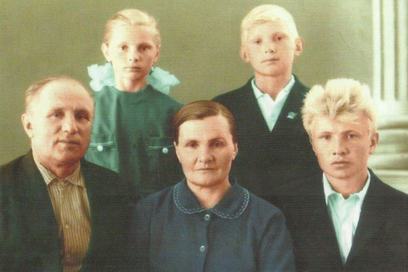 Бывшие спецпереселенцы Павел Александрович и Ольга Аркадьевна с детьми Николаем, Сергеем (2-й ряд справа), Марией (старший сын Александр служит в армии),