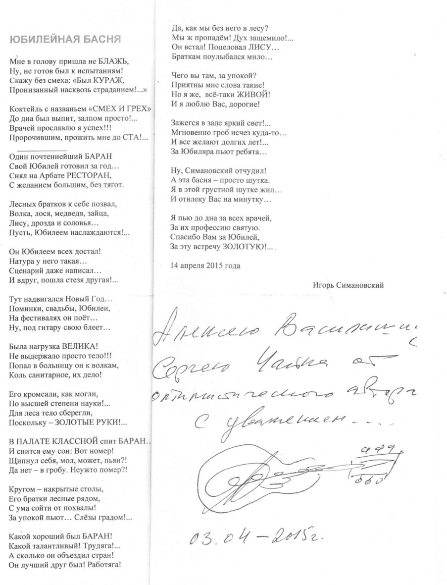 23 февраля 2017г., на 82-м году жизни после тяжелой и продолжительной болезни наш человек-эпоха ушел от нас. Ушел, как воин, с гитарой наперевес. Любимый многими автор-исполнитель, чьи песни были в репертуаре знаменитых артистов (например, 18-ть песен И.Симановского исполнял его друг, легендарный В.Трошин), лауреат многочисленных конкурсов, автор книг до последнего, сколько мог, выступал на сцене, принимал участие в благотворительных проектах, дарил себя людям. «Я живу на Земле, потому что люблю... Я живу на Земле, потому что горю... Я хочу на Земле созидать и творить... И поэтому мне очень хочется жить...» Глубоко скорбим…