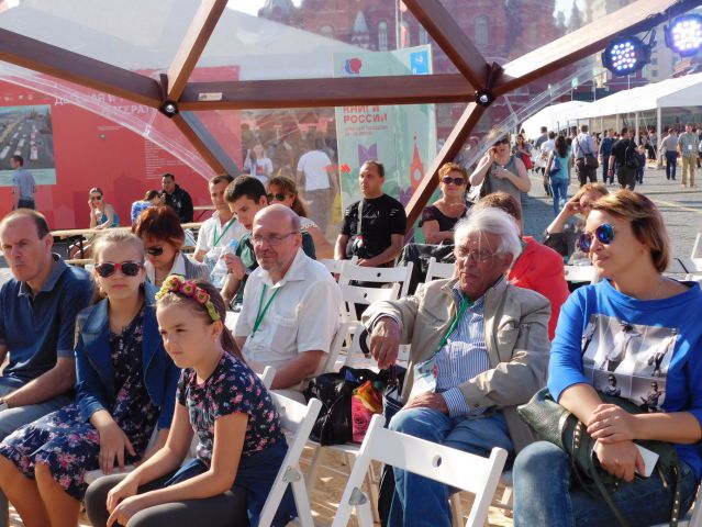 Итак, с утра 25 июня лил дождь. Земляков собралось немного. То ли дождя испугались, то ли оповещение было неполным. Нина Сосова, Галина Столбова, Василий Долгих, Лидия Уланова, Людмила Бялковская, Николай Сизов и я. Вот, кажется, и все. Пошли искать тюменский павильон. Он оказался под №13, у самой Спасской башни, ближе всех к главной сцене, где играл Денис Мацуев с симфоническим оркестром республики Татарстан. Красная площадь утопала в прелестных звуках, капли дождя барабанили по зонту, а глаза тянулись к книжным развалам. Вот они, родные наши «однополчане»: Еремей Айпин, Анатолий Омельчук, Леонид Иванов, Анна Неркаги, Александр Новопашин, Сергей Козлов..! Книги выстроились в ряд, выложены стопочками. А где же сами творцы? Кто-то сказал: «Пошли в ГУМ на пресс-конференцию». Надо же послушать! Кинулась туда. Где? Во сколько? На каком этаже? На какой линии? Но… не было там никакой конференции. Ребята просто разошлись пообедать. Фантазеры!