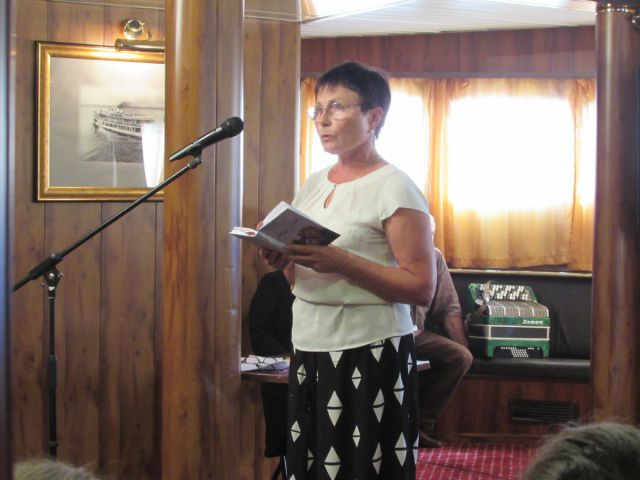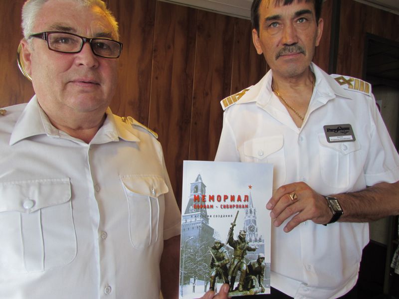 Как ведущая этой акции, вспомнила я и о нашем памятнике – Мемориальном комплексе воинам – сибирякам на 42 км Волоколамского шоссе, именуемом в народе рубежом боевой славы, который был возведен силами сибирских землячеств, находящихся в Москве,  в память о стойкости, мужестве и героизме сибирских дивизий, защищавших подступы к столице нашей Родины. Рассказала о военных захоронениях на его территории, Ленино-Снегиревском военно-историческом музее с экспозицией отечественной и трофейной техники, чем вызвала искренний интерес у молодых зрителей.  И по-сибирски щедро сделала подарки участникам войны, которых оказалось на теплоходе 5 человек, подарив им красочное издание "Мемориал  сибирякам" из домашнего архива. С большим почтением этот сборник воспоминаний от имени нашего землячества  я вручила  капитану  теплохода  Владимиру Михайловичу Матросову и его команде.