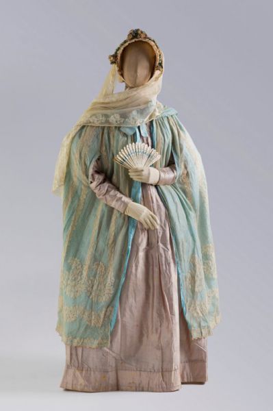 | Платье из шелка с жаккардовым рисунком. Франция, 1810 г. Шаль из коллекции А.Васильева | Бальное платье из шелка с ручной вышивкой с треном, 1910 г. Из коллекции А.Васильева |