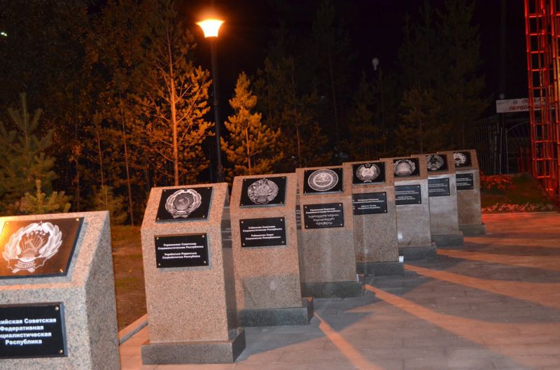 Идея открытия Аллеи дружбы народов принадлежит местному предпринимателю Олегу Яворскому, который решил таким вот комплексом воздать дань тому периоду жизни нашей страны, когда она была едина и могущественна. Идею поддержали в администрации города, в разработке проекта оказал содействие директор Музейно-выставочного центра Андрей Дробышев. А реализовали, как говорится, всем миром. Многие предприятия приняли участие в создании Аллеи, окружное правительство помогло средствами. Главный символ СССР - герб державы, гербы пятнадцати союзных республик и стилизованная Спасская башня Московского Кремля - вот составляющие комплекса.