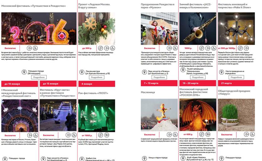 Департамент национальной политики, межрегиональных связей и туризма Москвы опубликовал Туристский событийный календарь столицы на новый 2016 год. С изданием приятно знакомиться и удобно работать: многочисленные праздники и юбилейные даты, фестивали, художественные и профессиональные выставки, концерты и спортивные форумы собраны в ряд разделов по месяцам и цветам событий. Вход на многие мероприятия свободный, найти по вкусу праздники в жизни нашего города и побывать на них может каждый.
